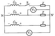 如图所示对称三相电路,电压表V1和V2的读数分别为220V和0V,打开开关S后,V1和V2的读数分别为( )。